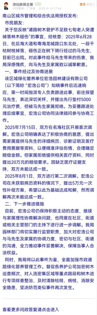 關(guān)于您反映“道路樹木管護(hù)不足致七旬老人突遭掉落林木砸傷”的事宜,經(jīng)核查:2025年6月28日,在后海大道和粵海龍城路口東北處,一段干枯樹枝掉落,砸傷正在樹下騎行經(jīng)過的馬先生,目前已出院。對(duì)此事件給馬先生帶來的傷害,我局深感愧疚,向馬先生及家屬致以誠摯歉意。