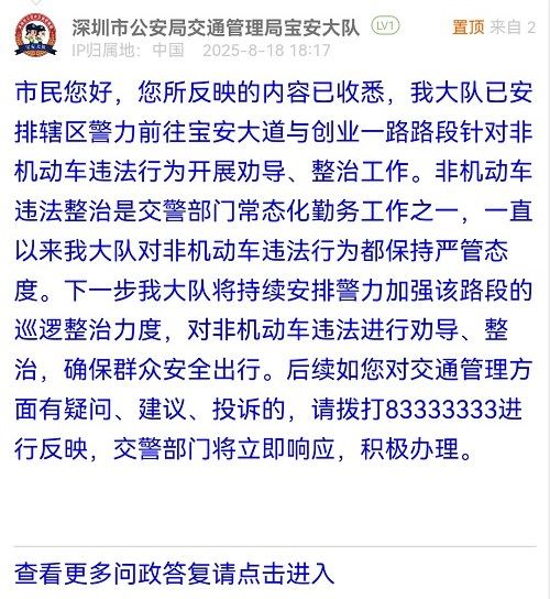 市民您好,您所反映的內(nèi)容已收悉,我大隊(duì)已安排轄區(qū)警力前往寶安大道與創(chuàng)業(yè)一路路段針對(duì)非機(jī)動(dòng)車違法行為開展勸導(dǎo)、整治工作。非機(jī)動(dòng)車違法整治是交警部門常態(tài)化勤務(wù)工作之一,一直以來我大隊(duì)對(duì)非機(jī)動(dòng)車違法行為都保持嚴(yán)管態(tài)度。下一步我大隊(duì)將持續(xù)安排警力加強(qiáng)該路段的巡邏整治力度,對(duì)非機(jī)動(dòng)車違法進(jìn)行勸導(dǎo)、整治,確保群眾安全出行。后續(xù)如您對(duì)交通管理方面有疑問、建議、投訴的,請(qǐng)撥打83333333進(jìn)行反映,交警部門將立即響應(yīng),積極辦理。