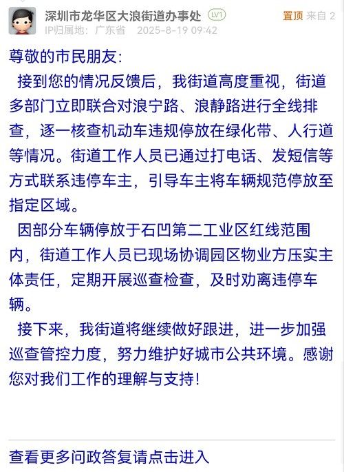 接到您的情況反饋后,我街道高度重視,街道多部門立即聯(lián)合對(duì)浪寧路、浪靜路進(jìn)行全線排查,逐一核查機(jī)動(dòng)車違規(guī)停放在綠化帶、人行道等情況。街道工作人員已通過打電話、發(fā)短信等方式聯(lián)系違停車主,引導(dǎo)車主將車輛規(guī)范停放至指定區(qū)域。