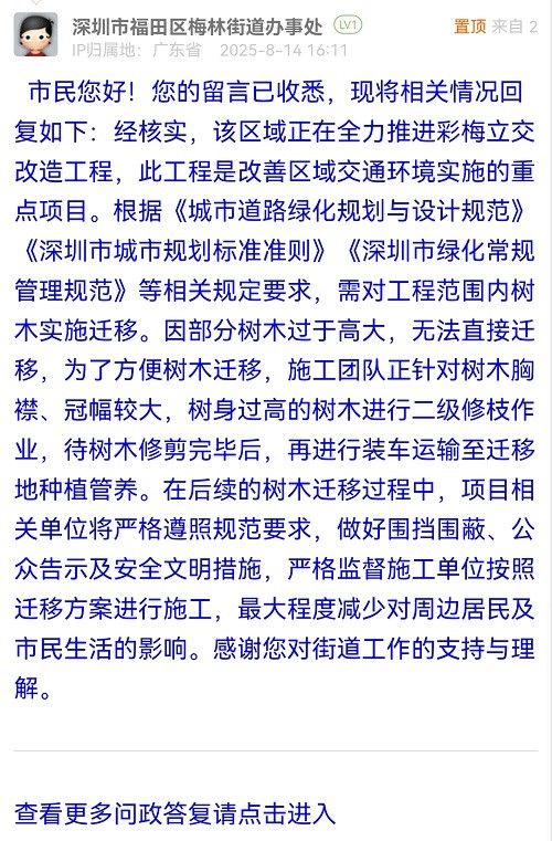 市民您好!您的留言已收悉,現(xiàn)將相關(guān)情況回復(fù)如下:經(jīng)核實(shí),該區(qū)域正在全力推進(jìn)彩梅立交改造工程,此工程是改善區(qū)域交通環(huán)境實(shí)施的重點(diǎn)項(xiàng)目。根據(jù)《城市道路綠化規(guī)劃與設(shè)計(jì)規(guī)范》《深圳市城市規(guī)劃標(biāo)準(zhǔn)準(zhǔn)則》《深圳市綠化常規(guī)管理規(guī)范》等相關(guān)規(guī)定要求,需對(duì)工程范圍內(nèi)樹木實(shí)施遷移。因部分樹木過于高大,無法直接遷移,為了方便樹木遷移,施工團(tuán)隊(duì)正針對(duì)樹木胸襟、冠幅較大,樹身過高的樹木進(jìn)行二級(jí)修枝作業(yè),待樹木修剪完畢后,再進(jìn)行裝車運(yùn)輸至遷移地種植管養(yǎng)。在后續(xù)的樹木遷移過程中,項(xiàng)目相關(guān)單位將嚴(yán)格遵照規(guī)范要求,做好圍擋圍蔽、公眾告示及安全文明措施,嚴(yán)格監(jiān)督施工單位按照遷移方案進(jìn)行施工,最大程度減少對(duì)周邊居民及市民生活的影響。感謝您對(duì)街道工作的支持與理解。