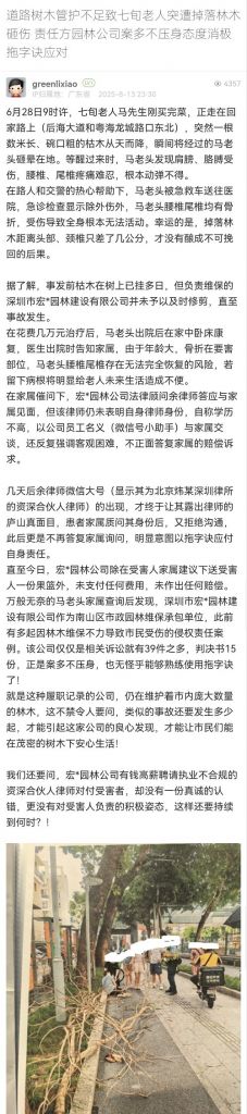 11. 帖文《道路樹木管護(hù)不足致七旬老人突遭掉落林木砸傷 責(zé)任方園林公司案多不壓身態(tài)度消極拖字訣應(yīng)對(duì)》