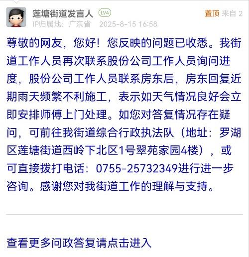 尊敬的網(wǎng)友,您好!您反映的問題已收悉。我街道工作人員再次聯(lián)系股份公司工作人員詢問進(jìn)度,股份公司工作人員聯(lián)系房東后,房東回復(fù)近期雨天頻繁不利施工,表示如天氣情況良好會(huì)立即安排師傅上門處理。如您對(duì)答復(fù)情況存在疑問,可前往我街道綜合行政執(zhí)法隊(duì)(地址:羅湖區(qū)蓮塘街道西嶺下北區(qū)1號(hào)翠苑家園4樓),或可直接撥打電話:0755-25732349進(jìn)行進(jìn)一步咨詢。感謝您對(duì)我街道工作的理解與支持。