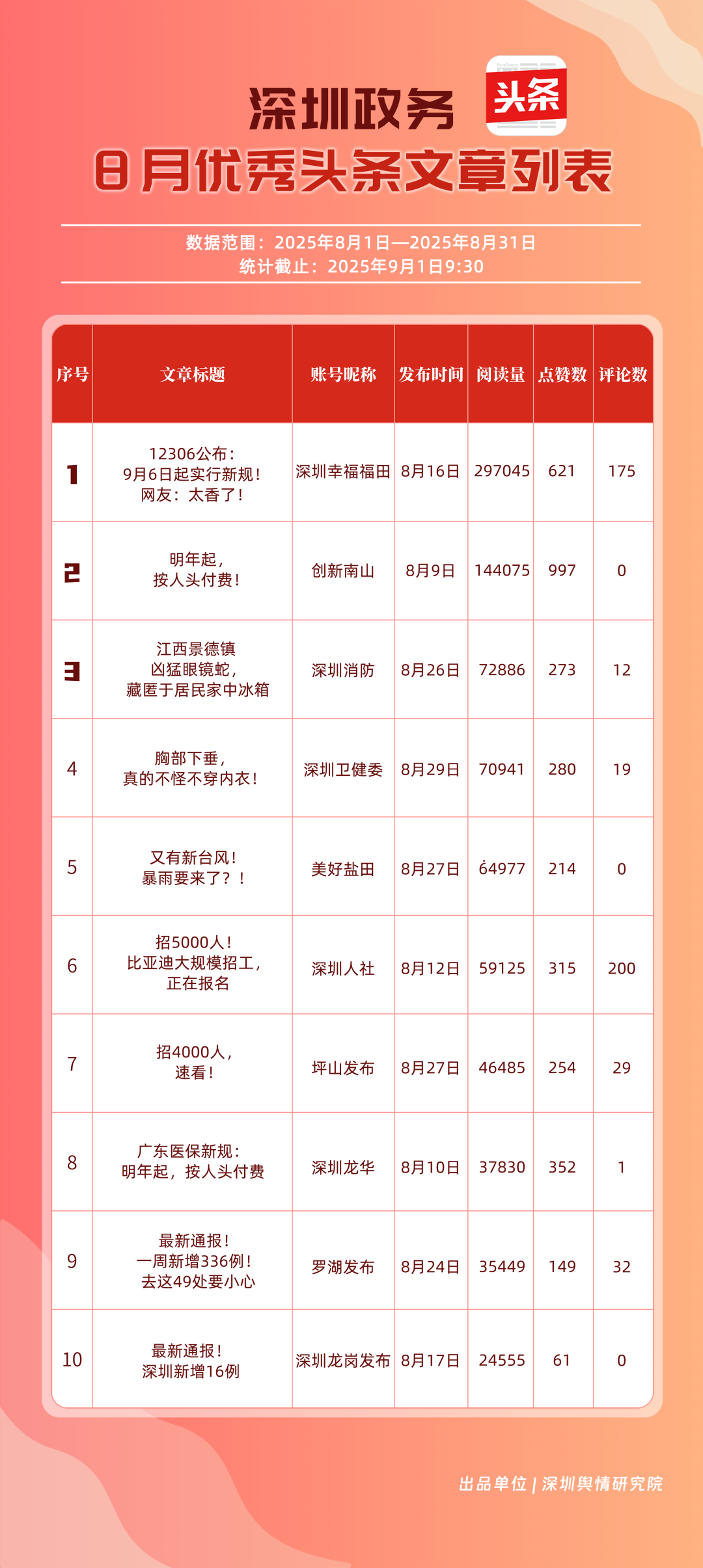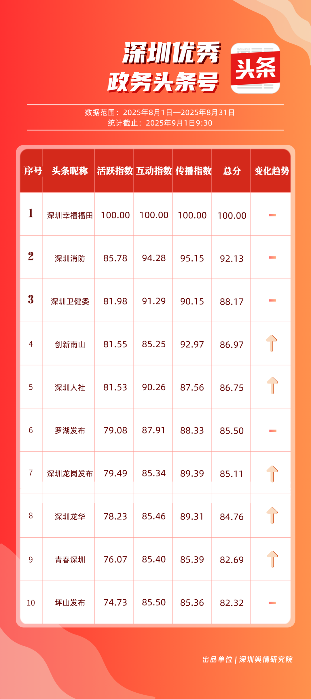 8月,“深圳幸福福田”“深圳消防”“深圳衛(wèi)健委”“創(chuàng)新南山”“深圳人社”“羅湖發(fā)布”“深圳龍崗發(fā)布”“深圳龍華”“青春深圳”“坪山發(fā)布”共10個政務頭條號入選“優(yōu)秀政務頭條號”榜單。“深圳幸福福田”憑借持續(xù)優(yōu)異的綜合表現(xiàn),以滿分成績穩(wěn)居榜單首位,彰顯出強大的政務傳播力與影響力;“深圳消防”“深圳衛(wèi)健委”則以穩(wěn)定的內容質量與深厚的民眾基礎,持續(xù)為市民提供權威、及時的服務信息,排名穩(wěn)固?!皠?chuàng)新南山”“深圳人社”等上榜賬號亦表現(xiàn)亮眼,聚焦民生服務傳遞政策溫度,共同構成政務新媒體矩陣的中堅力量,為城市治理與民生服務注入鮮活動能。