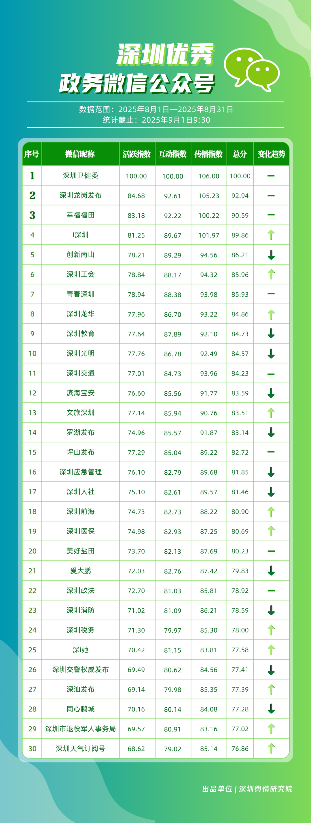 8月,30個政務微信公眾號入選“深圳優(yōu)秀政務微信公眾號”榜單,其中包括“深圳衛(wèi)健委”“深圳龍崗發(fā)布”“幸福福田”“i深圳”“創(chuàng)新南山”“深圳工會”“青春深圳”“深圳龍華”“深圳教育”“深圳光明”等。8月,“深圳衛(wèi)健委”66篇推文獲得超10萬次閱讀,以滿分位于榜單首位;“深圳龍崗發(fā)布”積極傳遞民生信息,依托區(qū)域活動開展宣傳,推動傳播效果顯著提升,位居第二;“幸福福田”關注區(qū)域發(fā)展動態(tài),排名第三?!癷深圳”“創(chuàng)新南山”“深圳工會”“青春深圳”等政務賬號在信息發(fā)布中不斷提升內容豐富性,深耕優(yōu)質服務,評分在85分以上。上榜微信公眾號立足自身特色優(yōu)勢,以精品內容為核心競爭力,在政務傳播領域樹立了標桿形象,成為兼具影響力與公信力的示范樣本。