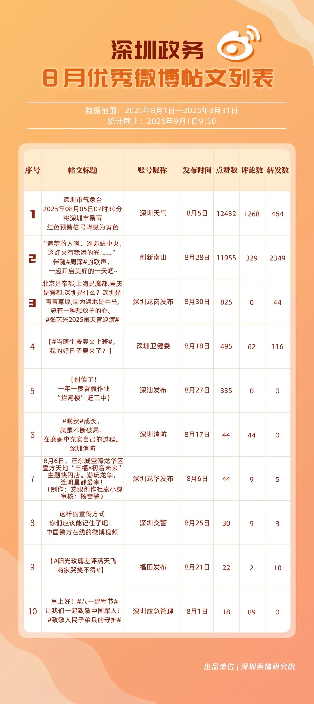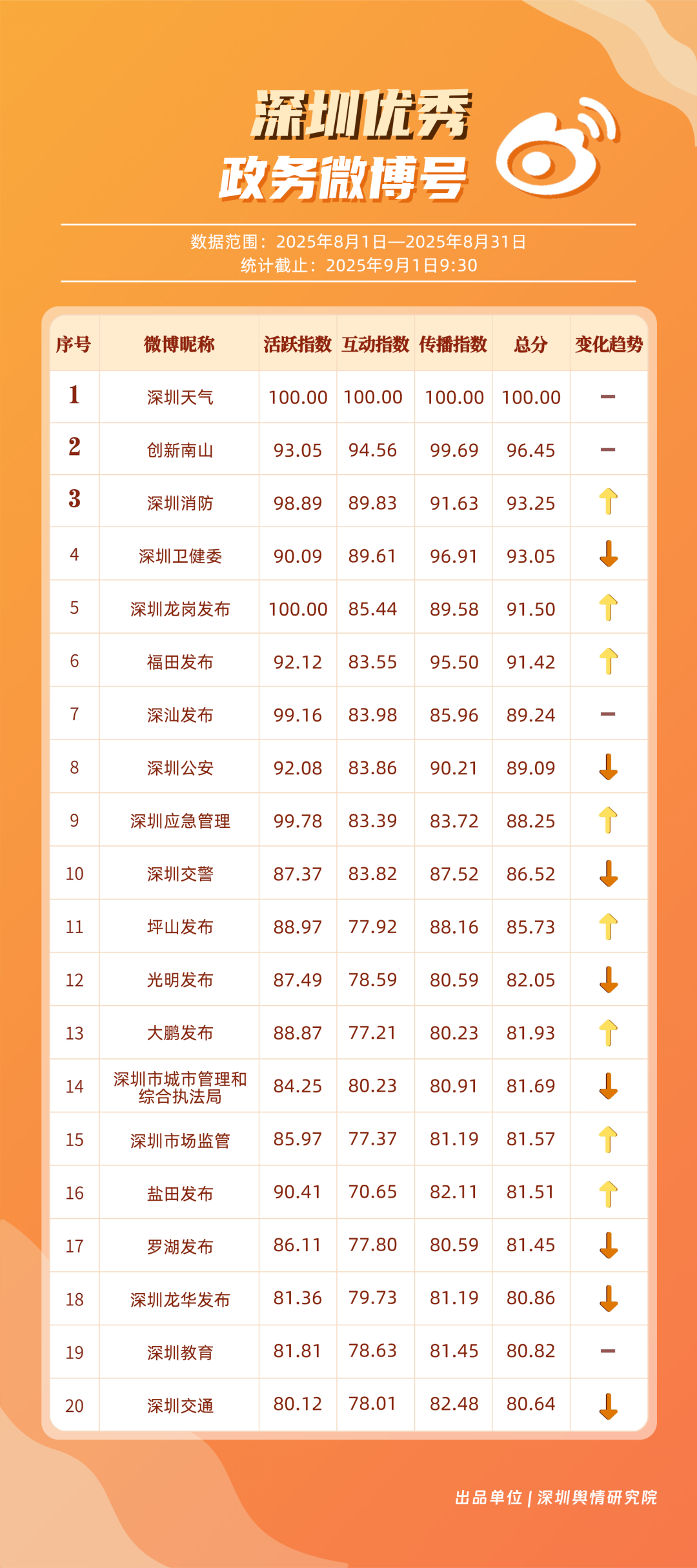 8月,“深圳天氣”“創(chuàng)新南山”“深圳消防”“深圳衛(wèi)健委”“深圳龍崗發(fā)布”“福田發(fā)布”“深汕發(fā)布”“深圳公安”“深圳應急管理”“深圳交警”等20個賬號入選“優(yōu)秀政務微博號”。其中,“深圳天氣”持續(xù)以優(yōu)質內容受到網民肯定,蟬聯(lián)榜首;“創(chuàng)新南山”傳播指數(shù)得分再提升,總分96.45,排名保持在第二位;“深圳消防”積極發(fā)布消防相關內容,以93.25分位列第三。上榜優(yōu)秀政務微博賬號精準把握網民興趣點,內容獨具風采,收獲網民認可,實現(xiàn)了較好的傳播效果。