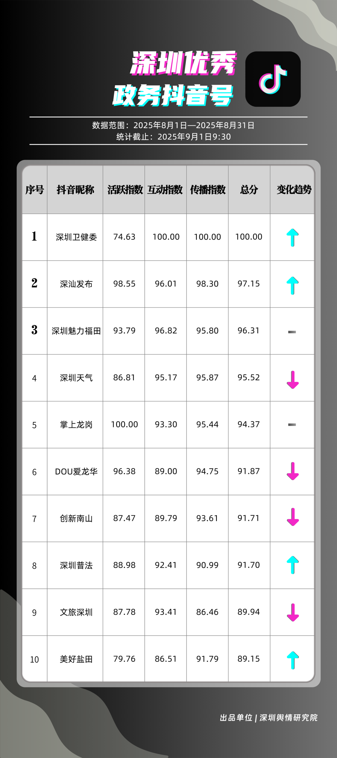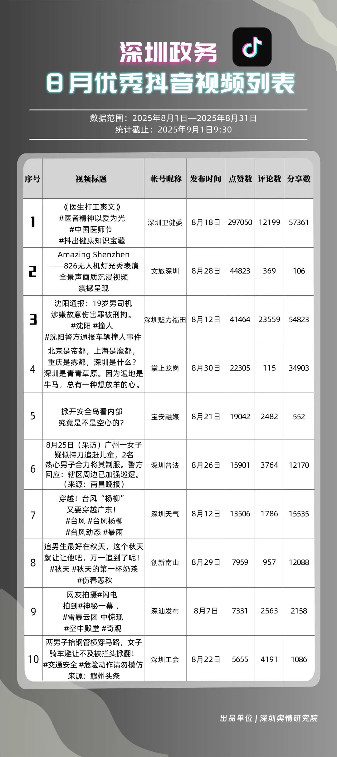 8月,“深圳衛(wèi)健委”“深汕發(fā)布”“深圳魅力福田”“深圳天氣”“掌上龍崗”“DOU愛龍華”“創(chuàng)新南山”“深圳普法”“文旅深圳”“美好鹽田”共10個政務抖音號獲得“優(yōu)秀政務抖音號”稱號?!吧钲谛l(wèi)健委”內容吸引大量網民關注,4條視頻累計獲得超50萬次點贊,排名從上期的第九名上升至第一名;“深汕發(fā)布”憑借較高的傳播指數(shù)評分,位列第二名,排名有所上升?!吧钲邝攘ΩL铩薄吧钲谔鞖狻钡荣~號緊隨其后,得分均在95分左右。上榜的優(yōu)秀政務抖音號深耕優(yōu)質創(chuàng)作,精準把握網民興趣點,使作品收獲高點贊、高轉發(fā),推動評論區(qū)形成良性互動氛圍,以優(yōu)秀內容提升政務傳播效能。