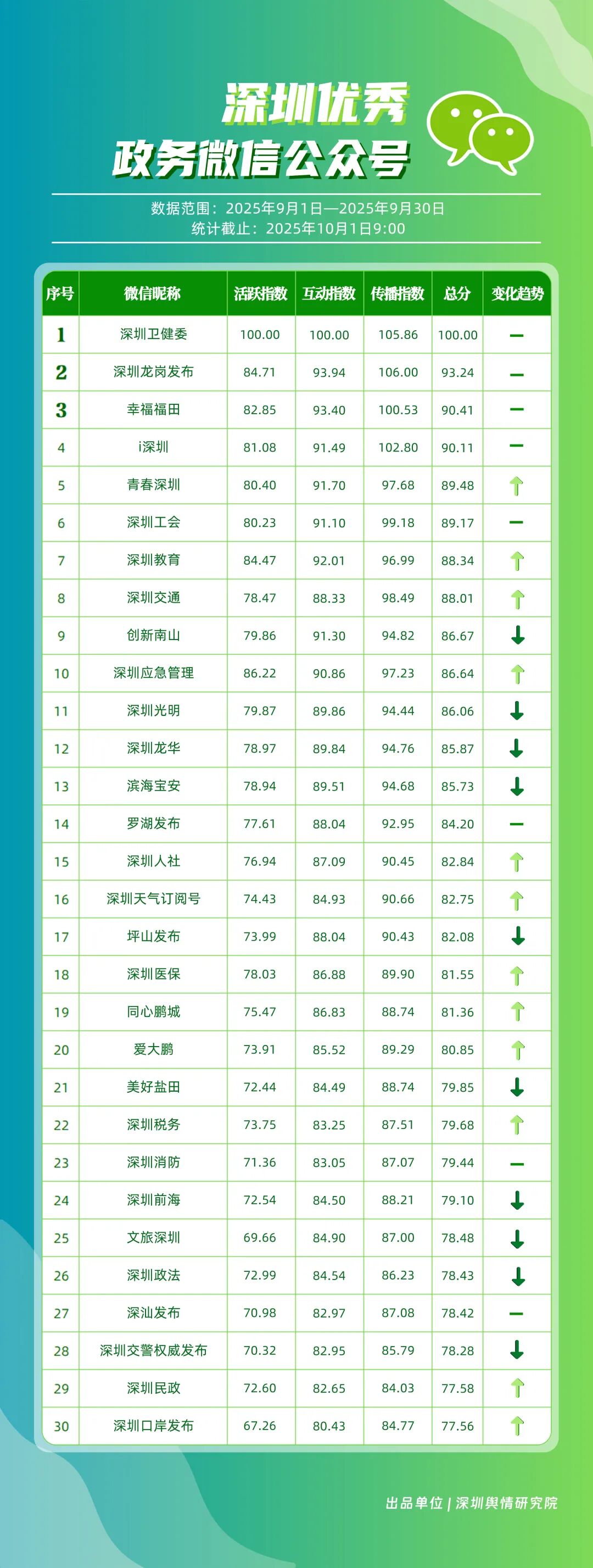 9月,“深圳衛(wèi)健委”“深圳龍崗發(fā)布”“幸福福田”“i深圳”“青春深圳”“深圳工會(huì)”“深圳教育”“深圳交通”“創(chuàng)新南山”“深圳應(yīng)急管理”等30個(gè)政務(wù)微信公眾號(hào)榮登“深圳優(yōu)秀政務(wù)微信公眾號(hào)”榜單。9月,“深圳衛(wèi)健委”以總分100.00的成績(jī)蟬聯(lián)榜單首位,其憑借突破常規(guī)視角的選題,解讀專業(yè)健康知識(shí),引發(fā)大量網(wǎng)民共鳴,內(nèi)容質(zhì)量與傳播力形成雙向賦能;“深圳龍崗發(fā)布”以總分93.24位居第二,聚焦區(qū)域民生服務(wù)升級(jí)等動(dòng)態(tài),信息觸達(dá)率不斷提升;“幸福福田”圍繞商圈經(jīng)濟(jì)復(fù)蘇、文化節(jié)慶活動(dòng)等主題開展系列宣傳,增強(qiáng)區(qū)域活力展示,位列第三;“i深圳”“青春深圳”“深圳工會(huì)”等也持續(xù)優(yōu)化賬號(hào)內(nèi)容,通過實(shí)用信息推送強(qiáng)化政務(wù)服務(wù)定位。