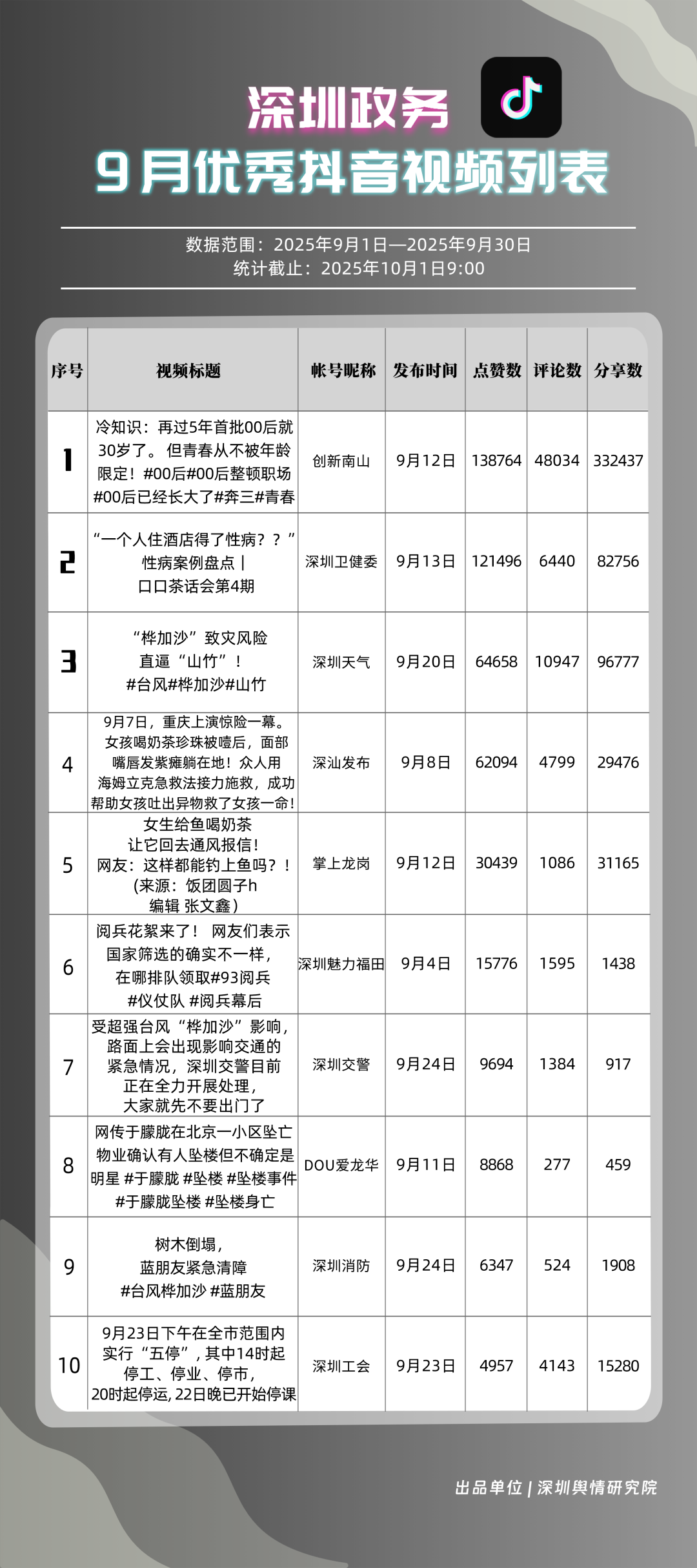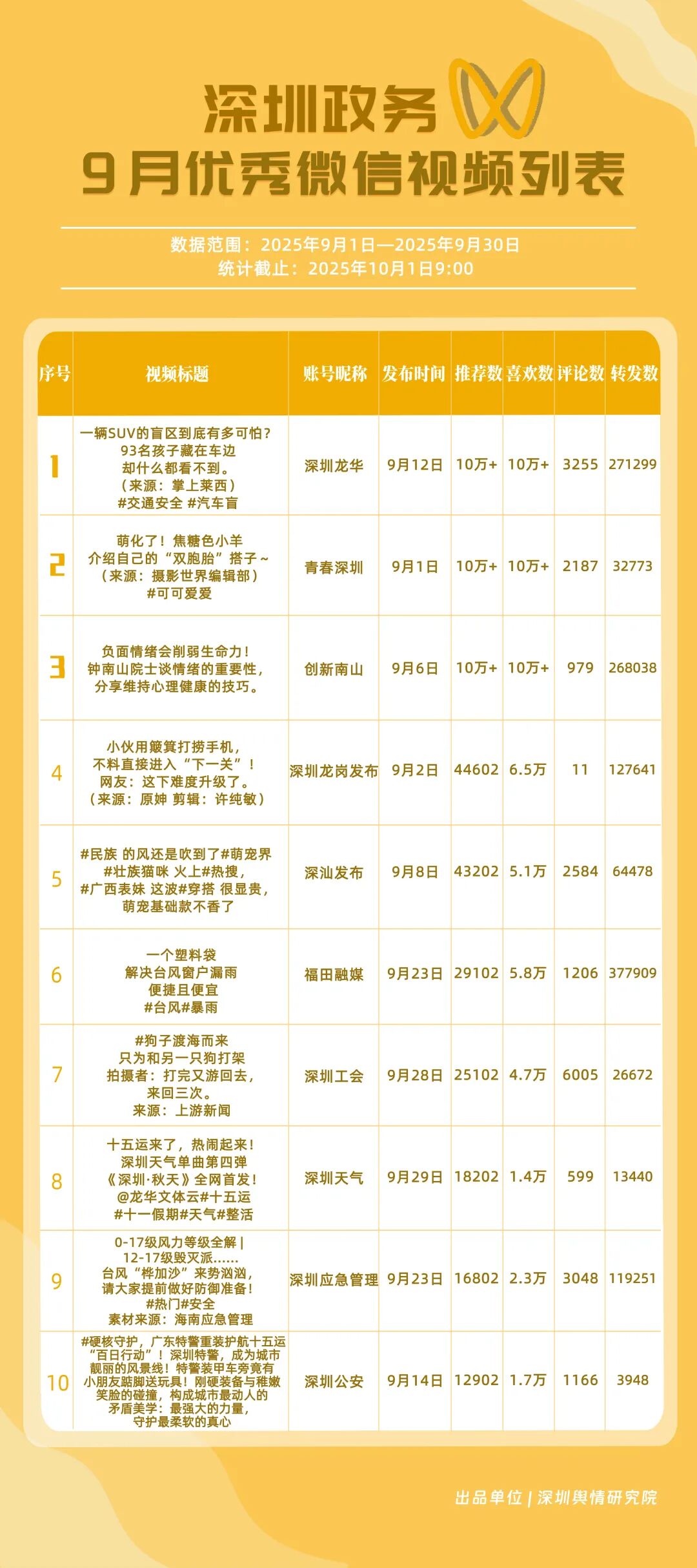 9月,深圳政務(wù)新媒體矩陣持續(xù)優(yōu)化內(nèi)容生態(tài),各單位依托平臺(tái)特色深化服務(wù)效能,南山區(qū)、市衛(wèi)生健康委員會(huì)、市氣象局(臺(tái))、龍崗區(qū)、福田區(qū)、龍華區(qū)、深汕特別合作區(qū)、市應(yīng)急管理局、中國(guó)共產(chǎn)主義青年團(tuán)深圳市委員會(huì)、光明區(qū)的新媒體矩陣入選“深圳優(yōu)秀政務(wù)新媒體矩陣”榜單。9月,南山區(qū)在短視頻平臺(tái)表現(xiàn)突出,抖音、微信視頻號(hào)平臺(tái)均獲滿分;市衛(wèi)生健康委員會(huì)輸出深度內(nèi)容,位列榜單第二;市氣象局(臺(tái))新媒體矩陣居于榜單第三,在9月發(fā)布臺(tái)風(fēng)相關(guān)天氣提醒,獲得公眾廣泛關(guān)注。此外,龍崗區(qū)、福田區(qū)、龍華區(qū)、深汕特別合作區(qū)新媒體矩陣持續(xù)推出優(yōu)質(zhì)內(nèi)容,共同展現(xiàn)了深圳在塑造現(xiàn)代化形象、提升數(shù)字治理能力上的創(chuàng)新引領(lǐng)作用。