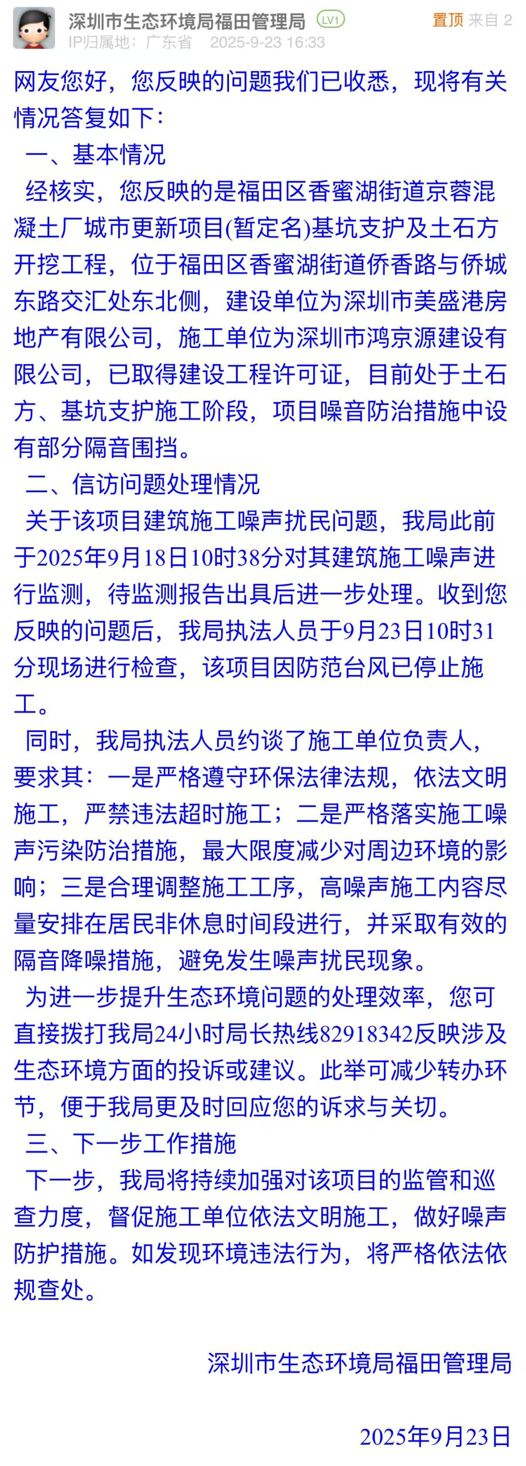 優(yōu)化建議:在訴求中,市民表示施工噪音可以忍耐,但希望“灰塵大”情況可以得到緩解,并附圖展示現(xiàn)場(chǎng)情況。市生態(tài)環(huán)境局福田管理局在回應(yīng)中,僅聚焦建筑施工噪聲,對(duì)“灰塵污染”只字未提,與市民訴求脫節(jié)。建議后續(xù)提高訴求匹配度,用務(wù)實(shí)的態(tài)度回應(yīng)市民對(duì)居住環(huán)境、城市建設(shè)的關(guān)切,避免因回應(yīng)不完整引發(fā)新的治理信任問題。