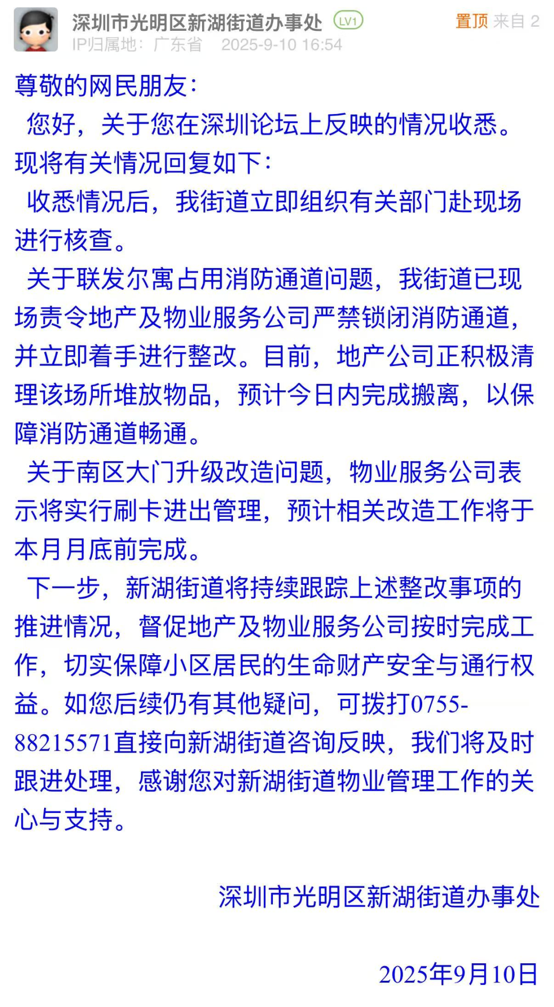 案例點(diǎn)評(píng):消防通道是保障居民生命安全的“生命通道”,在突發(fā)狀況下肩負(fù)著關(guān)鍵作用。針對(duì)小區(qū)消防通道被違規(guī)占用這一安全隱患,新湖街道辦第一時(shí)間責(zé)令責(zé)任方整改,高效推動(dòng)障礙物清理,暢通消防通道。對(duì)于市民小區(qū)大門升級(jí)改造的訴求,街道辦的回應(yīng)明確了刷卡管理改造的時(shí)間節(jié)點(diǎn),以實(shí)際行動(dòng)推動(dòng)安全隱患消除、提升小區(qū)管理品質(zhì),充分彰顯了基層治理的責(zé)任擔(dān)當(dāng)與務(wù)實(shí)智慧。