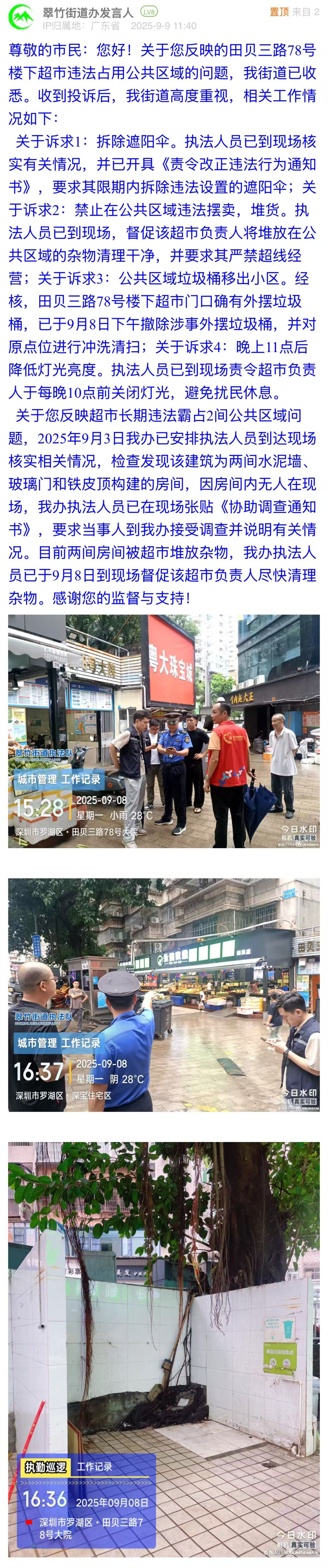 案例點(diǎn)評(píng):本案例中,翠竹街道辦立足市民訴求,對(duì)違規(guī)搭建遮陽傘、占用公共區(qū)域、違規(guī)堆放垃圾、店面燈牌亮度過高這四個(gè)問題,街道均做到快速響應(yīng),并以圖片展示治理效果。回應(yīng)既體現(xiàn)了基層執(zhí)法的規(guī)范性與時(shí)效性,又展現(xiàn)了對(duì)民生細(xì)節(jié)的關(guān)注力,踐行了“小事不小辦、事事有回音”的理念,為同類民生訴求的解決提供了可借鑒范式。