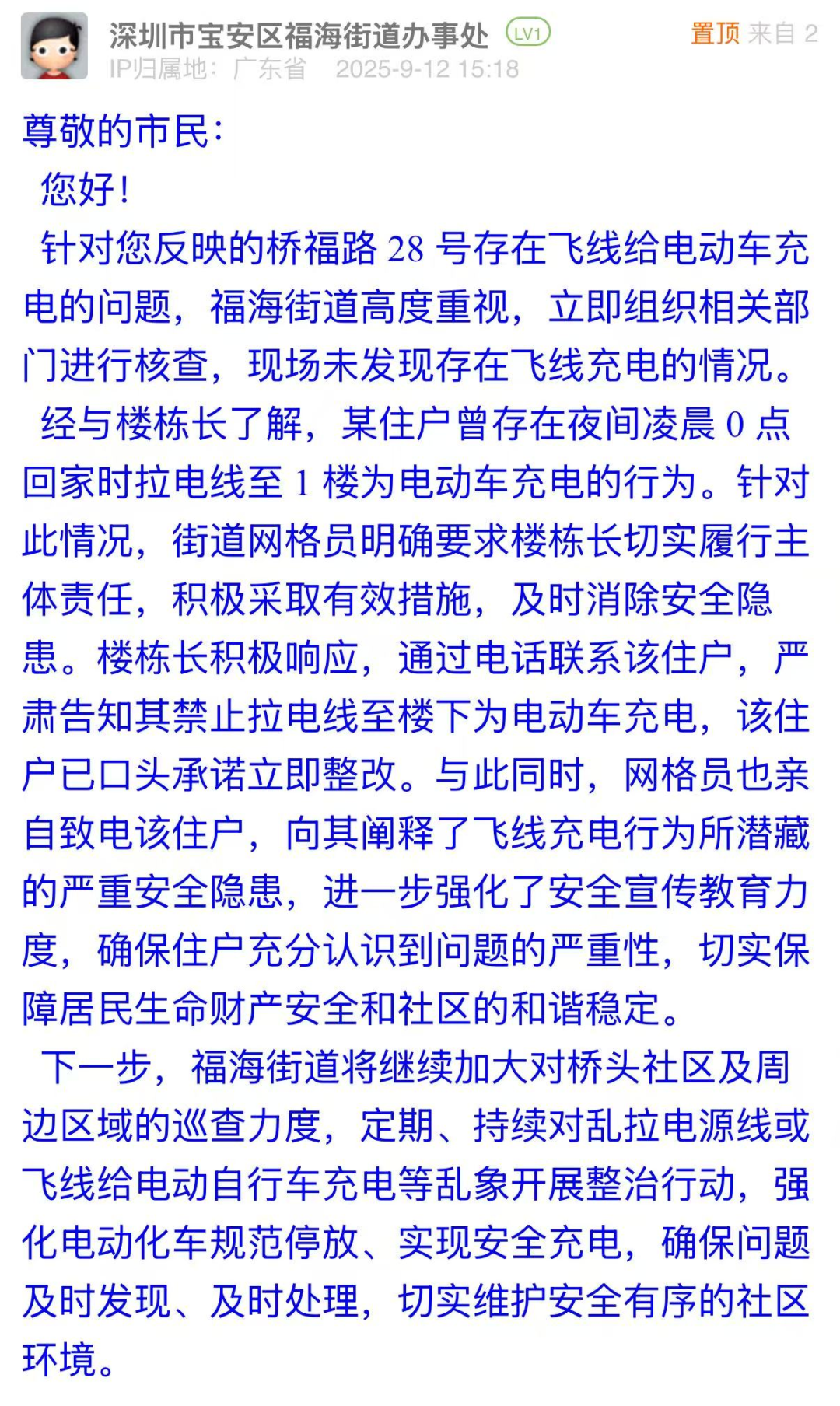 案例點(diǎn)評(píng):福海街道辦對(duì)電動(dòng)車“飛線充電”問題展現(xiàn)出快速響應(yīng)、權(quán)責(zé)明晰的治理態(tài)度,第一時(shí)間組織核查,既明確主體責(zé)任、嚴(yán)令整改,又細(xì)致開展安全教育,讓住戶充分認(rèn)知“飛線充電”的嚴(yán)重危害,體現(xiàn)執(zhí)法和普法的雙重?fù)?dān)當(dāng)?;貞?yīng)中,街道辦還表示將強(qiáng)化巡查力度、開展整治行動(dòng),建立長(zhǎng)效治理機(jī)制,維護(hù)社區(qū)安全秩序,彰顯了基層治理中“問題導(dǎo)向、標(biāo)本兼治”的治理邏輯。