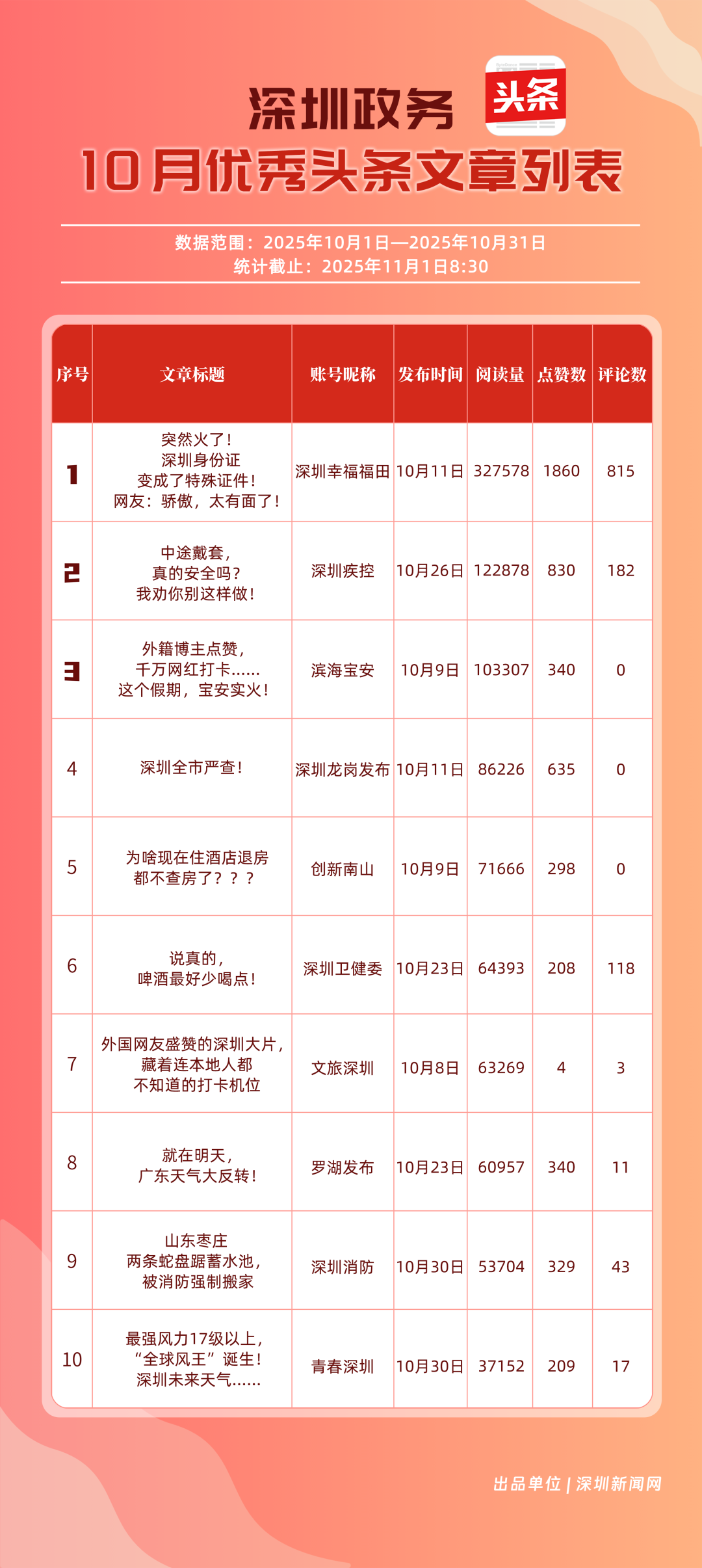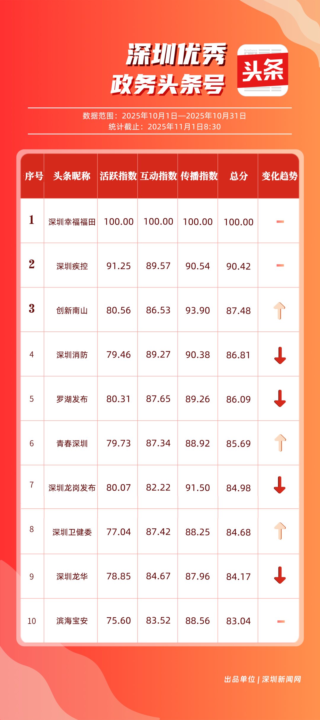 10月,“深圳幸福福田”“深圳疾控”“創(chuàng)新南山”“深圳消防”“羅湖發(fā)布”“青春深圳”“深圳龍崗發(fā)布”“深圳衛(wèi)健委”“深圳龍華”“濱海寶安”共10個(gè)政務(wù)頭條號(hào)入選“優(yōu)秀政務(wù)頭條號(hào)”榜單?!吧钲谛腋8L铩痹诨钴S、互動(dòng)、傳播均收獲較好成果,蟬聯(lián)榜首;“深圳疾控”得分超90分,持續(xù)發(fā)布民生健康類內(nèi)容,為市民健康保駕護(hù)航;“創(chuàng)新南山”內(nèi)容創(chuàng)作緊扣民生與區(qū)域特色,位列榜單第三名?!吧钲谙馈薄傲_湖發(fā)布”等賬號(hào)也位列榜單前列,成為區(qū)域政務(wù)新媒體內(nèi)容創(chuàng)新、信息傳遞的標(biāo)桿。
