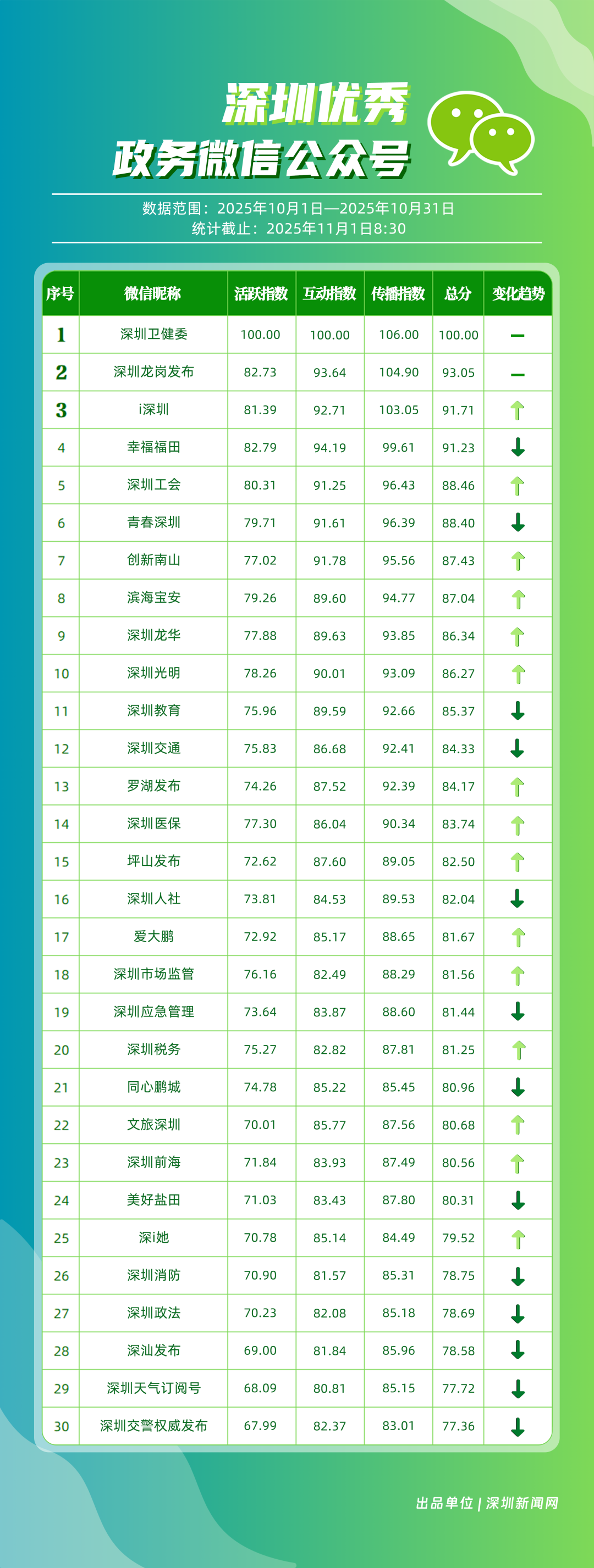 10月,“深圳衛(wèi)健委”“深圳龍崗發(fā)布”“i深圳”“幸福福田”“深圳工會(huì)”“青春深圳”“創(chuàng)新南山”“濱海寶安”“深圳龍華”“深圳光明”等30個(gè)政務(wù)微信公眾號(hào)榮登“深圳優(yōu)秀政務(wù)微信公眾號(hào)”榜單。10月,“深圳衛(wèi)健委”以總分100位居榜首,其持續(xù)以真誠(chéng)、反套路的內(nèi)容,將專業(yè)健康知識(shí)轉(zhuǎn)化為網(wǎng)民喜聞樂見的“生活指南”,受到大量網(wǎng)民喜愛;“深圳龍崗發(fā)布”位居第二,持續(xù)發(fā)布高質(zhì)量?jī)?nèi)容,成為市民獲取龍崗動(dòng)態(tài)的“第一窗口”;“i深圳”也發(fā)布政策、民生內(nèi)容,排名有所上升,位列第三;“幸福福田”“深圳工會(huì)”等也立足區(qū)域特色,通過多元內(nèi)容,展現(xiàn)各自的發(fā)展活力。