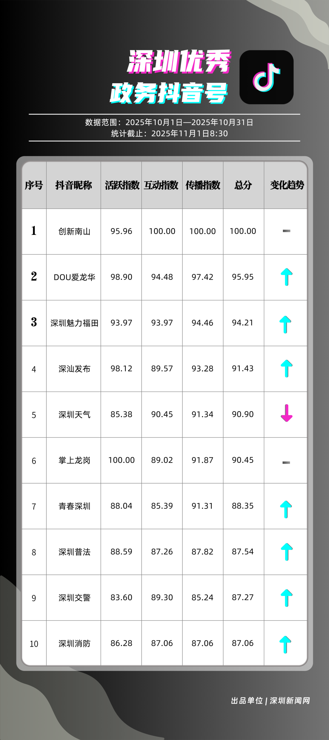 10月,獲得“優(yōu)秀政務(wù)抖音號(hào)”稱號(hào)的是“創(chuàng)新南山”“DOU愛龍華”“深圳魅力福田”“深汕發(fā)布”“深圳天氣”“掌上龍崗”“青春深圳”“深圳普法”“深圳交警”“深圳消防”。“創(chuàng)新南山”以總分100分居于榜首,展現(xiàn)出其內(nèi)容創(chuàng)作對(duì)用戶的強(qiáng)大吸引力與傳播力;“DOU愛龍華”與“深圳魅力福田”分別位列第二、三位,得分在95分左右,排名較上期有所上升。“深汕發(fā)布”“深圳天氣”“掌上龍崗”等賬號(hào)得分均在90分以上,以年輕化表達(dá)展示實(shí)用信息,也收獲較好互動(dòng)、傳播成績(jī)。