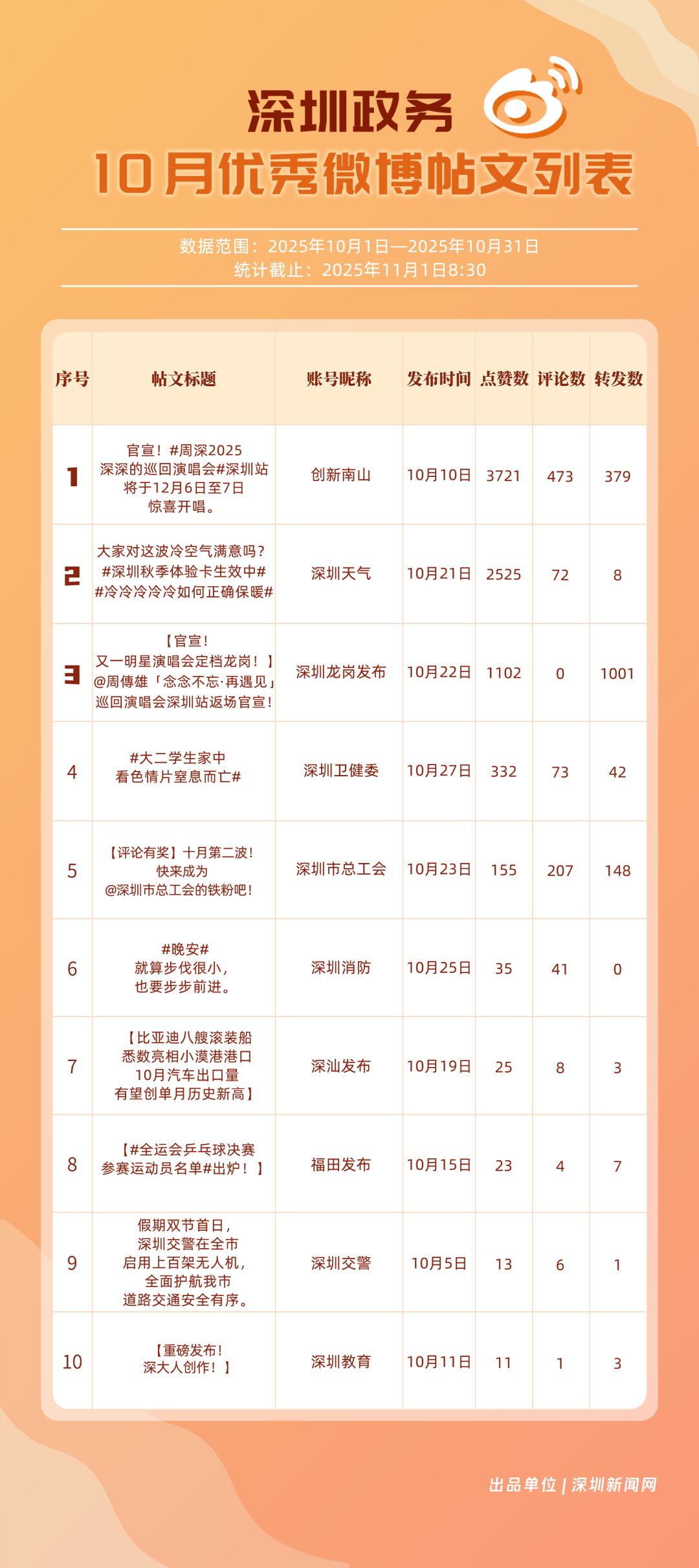 10月,20個(gè)賬號(hào)入選“優(yōu)秀政務(wù)微博號(hào)”榜單,其中包括:“深圳天氣”“深圳龍崗發(fā)布”“深圳市總工會(huì)”“深圳消防”“創(chuàng)新南山”“福田發(fā)布”“深圳衛(wèi)健委”“深汕發(fā)布”“深圳應(yīng)急管理”“深圳公安”等。其中,“深圳天氣”高頻、及時(shí)地發(fā)布天氣相關(guān)內(nèi)容,其中多篇關(guān)于“冷空氣”“入秋”帖文收獲較好互動(dòng)和傳播效果,以100分位列榜單首位;“深圳龍崗發(fā)布”總分97.37分,居于榜單第二,其有關(guān)演唱會(huì)定檔、卷尺哥等內(nèi)容的帖文獲得較好數(shù)據(jù);“深圳市總工會(huì)”關(guān)注職工日常生活,以97.03分居于榜單第三?!吧钲谙馈薄皠?chuàng)新南山”等微博賬號(hào)也通過各自的特色內(nèi)容,展現(xiàn)深圳城市治理、民生服務(wù)的溫度。