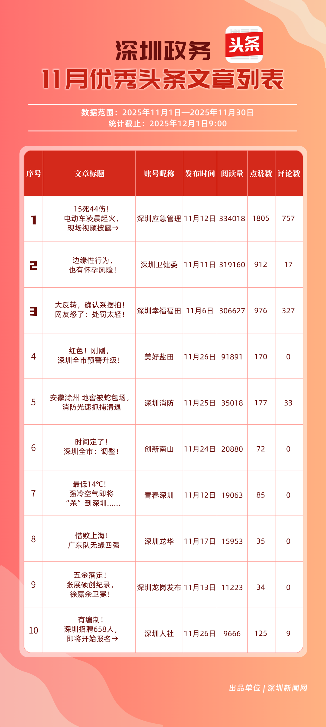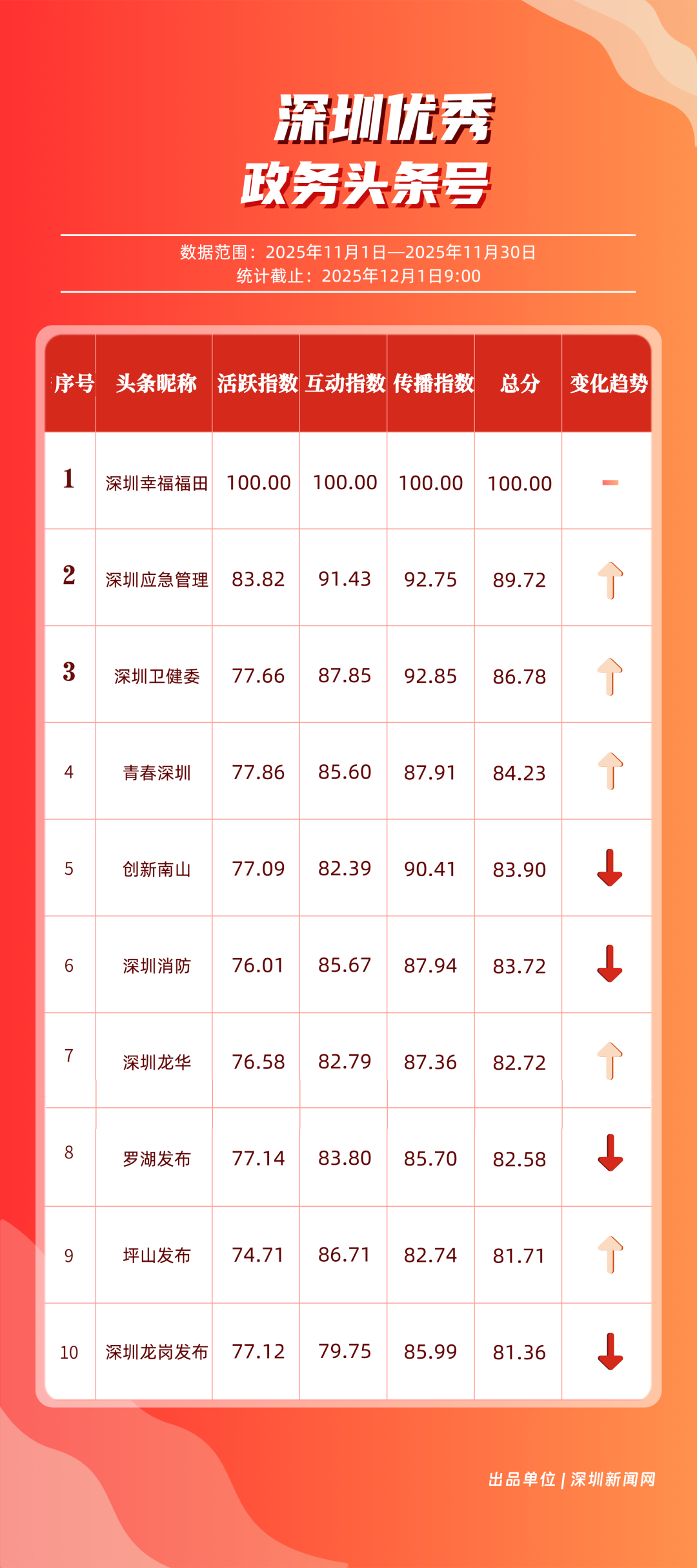 11月,“深圳幸福福田”“深圳應急管理”“深圳衛(wèi)健委”“青春深圳”“創(chuàng)新南山”“深圳消防”“深圳龍華”“羅湖發(fā)布”“坪山發(fā)布”“深圳龍崗發(fā)布”共10個政務頭條號入選“優(yōu)秀政務頭條號”榜單?!吧钲谛腋8L铩卑l(fā)揮穩(wěn)定,以滿分成績蟬聯(lián)榜首,彰顯出強大的政務傳播力與影響力;“深圳應急管理”積極發(fā)布應急、安全類內容,位居第二;“深圳衛(wèi)健委”則以優(yōu)質健康類信息吸引市民關注,排名上升至第3位。“青春深圳”“創(chuàng)新南山”“深圳消防”得分在83分以上。相關上榜賬號以內容創(chuàng)新為紐帶,聚焦民生,為城市治理現(xiàn)代化與民生服務精細化注入了鮮活力量。