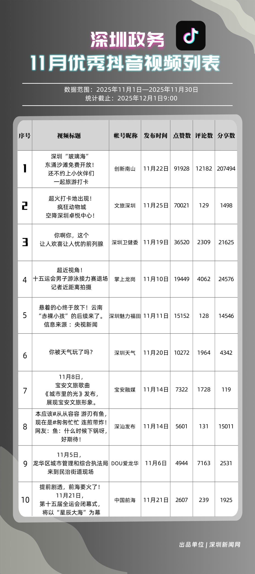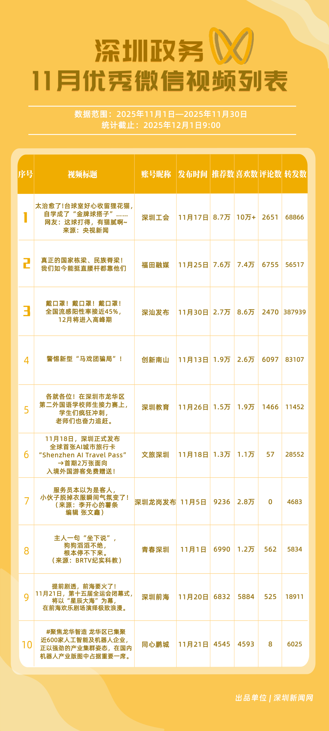 11月,“福田融媒”“深汕發(fā)布”“深圳工會”“創(chuàng)新南山”“深圳教育”“文旅深圳”“深圳光明”“深圳應急管理”“深圳天氣”“深圳龍華”榮獲“優(yōu)秀政務微信視頻號”稱號。“福田融媒”月總轉發(fā)量超60萬次,各方面發(fā)揮穩(wěn)定,位居榜單第一;“深汕發(fā)布”一條“流感陽性”視頻提醒市民關注健康信息,單條視頻轉發(fā)超30萬次,助推其位列榜單第二名;“深圳工會”積極轉載網絡熱門信息,內容多元,位列榜單第三名?!皠?chuàng)新南山”“深圳教育”等賬號緊隨其后。上榜微信視頻號以輕量化短視頻為載體,將政務信息轉化為公眾喜聞樂見的內容形式,最終打造出兼具傳播力與親和力的政務宣傳新名片。