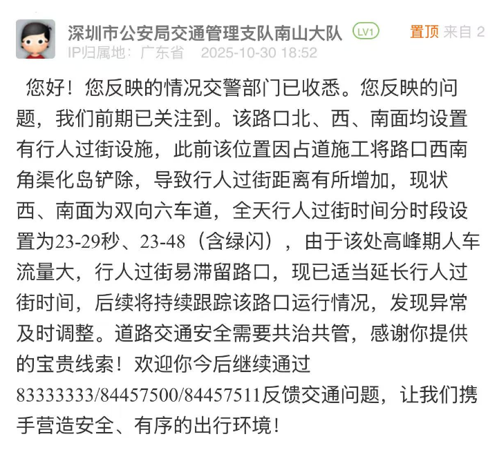 案例點(diǎn)評(píng):南山交管部門(mén)在24小時(shí)內(nèi)對(duì)市民所反饋的問(wèn)題進(jìn)行答復(fù),展現(xiàn)出精準(zhǔn)、高效的治理態(tài)度,既說(shuō)明過(guò)街時(shí)間短的原因,又根據(jù)該路口在高峰期人流大的實(shí)際情況,適當(dāng)延長(zhǎng)過(guò)街時(shí)間,體現(xiàn)出“因需調(diào)整、務(wù)實(shí)便民”的理念。回應(yīng)中,該部門(mén)還強(qiáng)調(diào)后續(xù)將持續(xù)跟蹤路口通行情況、及時(shí)優(yōu)化調(diào)整等,展示了精細(xì)化治理的決心和理念。