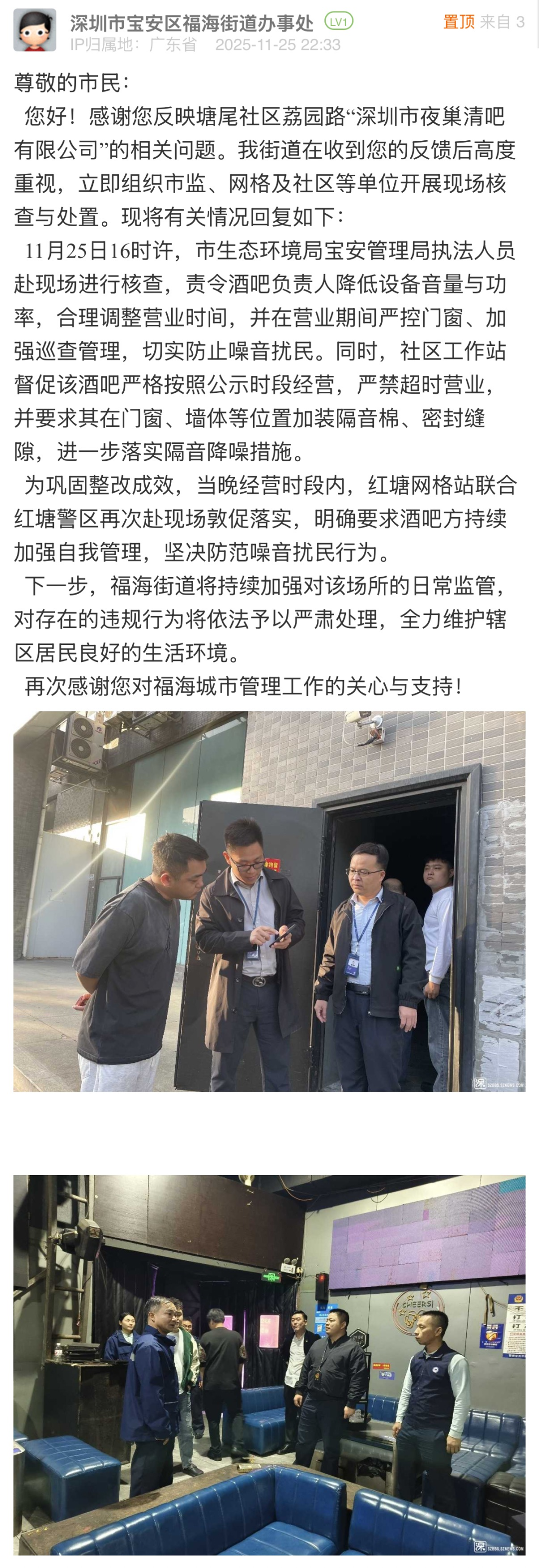 案例點(diǎn)評(píng):針對(duì)市民反映的問(wèn)題,福海街道辦與市生態(tài)環(huán)境局寶安管理局快速響應(yīng)、協(xié)同處置,在24小時(shí)內(nèi)組織工作人員開(kāi)展線(xiàn)下核查,現(xiàn)場(chǎng)責(zé)令店鋪整改,嚴(yán)禁其超時(shí)營(yíng)業(yè),并要求加裝隔音棉、密封縫隙,加強(qiáng)降噪。在發(fā)出整改要求當(dāng)晚,網(wǎng)格站聯(lián)合警區(qū)再次到現(xiàn)場(chǎng)復(fù)查,督促整改要求落實(shí),同時(shí)公開(kāi)執(zhí)法圖片向公眾反饋處置進(jìn)展,有效回應(yīng)市民關(guān)切,體現(xiàn)了務(wù)實(shí)高效的工作作風(fēng)。