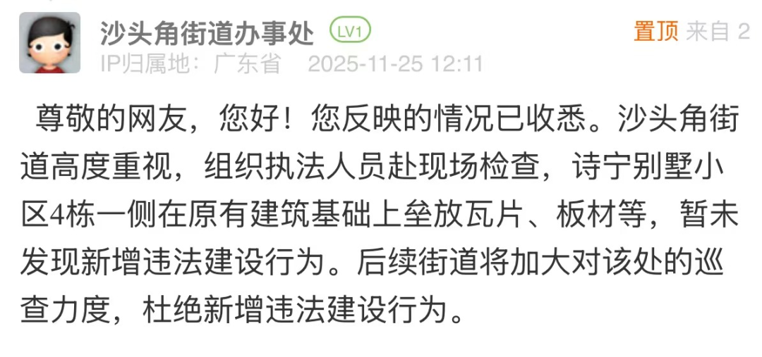 針對(duì)網(wǎng)民投訴的小區(qū)違建問(wèn)題,街道回應(yīng)僅以“未發(fā)現(xiàn)新增違法建設(shè)行為”簡(jiǎn)單回復(fù),尚有完善空間。若該點(diǎn)位存在建設(shè)年代久遠(yuǎn)、權(quán)屬界定模糊、涉及多主體協(xié)調(diào)等客觀難點(diǎn),可適度說(shuō)明,并在回應(yīng)中補(bǔ)充核查細(xì)節(jié),說(shuō)明后續(xù)處置方向與階段計(jì)劃,讓回應(yīng)更具可信度和實(shí)操性,回應(yīng)市民對(duì)“依法履職”的期待。