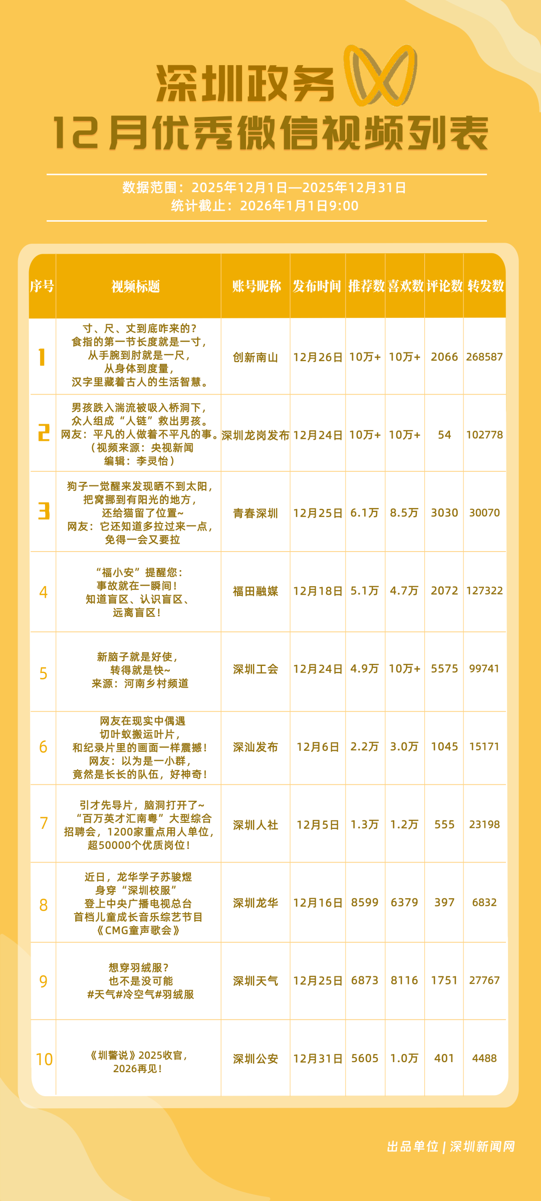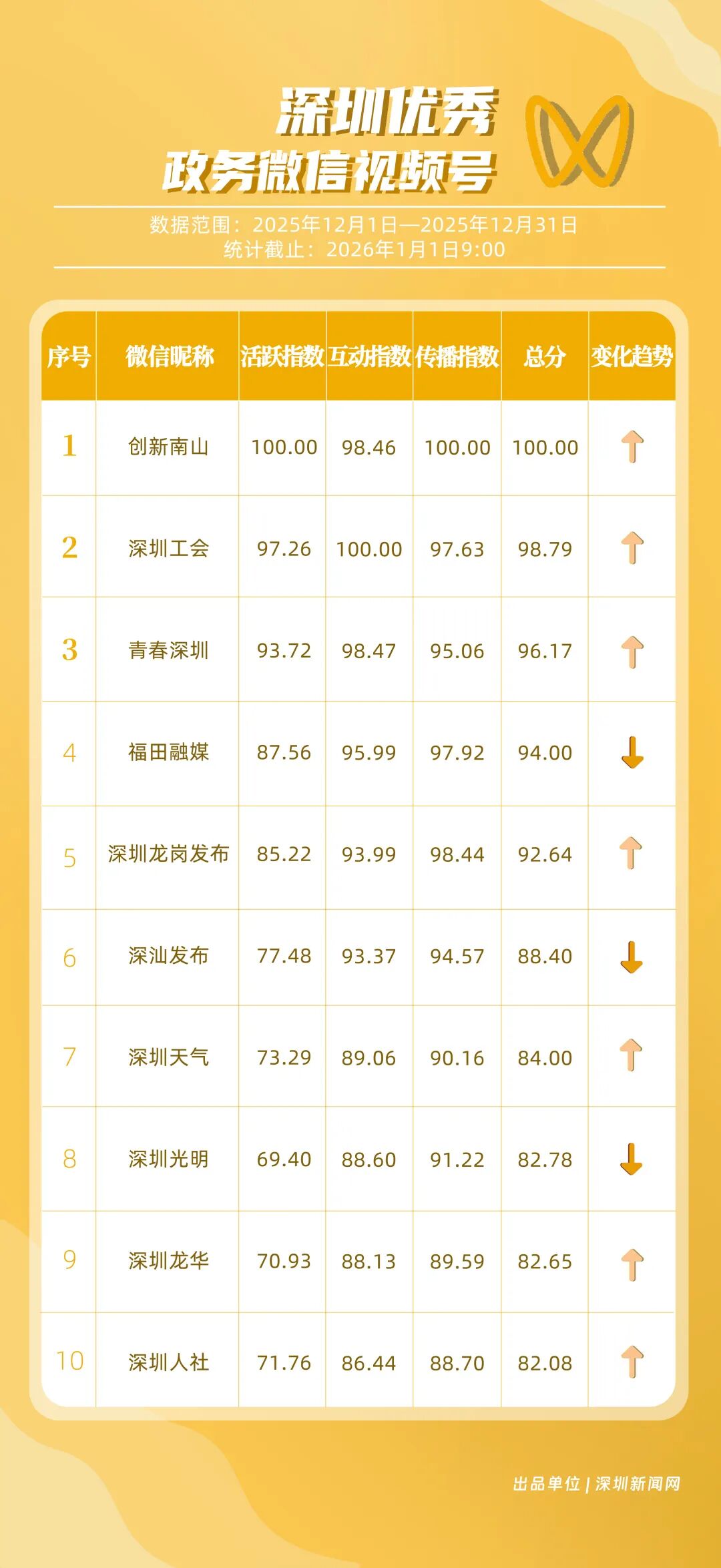 12月,“創(chuàng)新南山”“深圳工會(huì)”“青春深圳”“福田融媒”“深圳龍崗發(fā)布”“深汕發(fā)布”“深圳天氣”“深圳光明”“深圳龍華”“深圳人社”榮獲“優(yōu)秀政務(wù)微信視頻號(hào)”稱號(hào)。創(chuàng)新南山”活躍指數(shù)、傳播指數(shù)均獲滿分,月作品總轉(zhuǎn)發(fā)量超70萬(wàn),領(lǐng)跑榜單;“深圳工會(huì)”積極發(fā)布熱點(diǎn)、民生類內(nèi)容,精準(zhǔn)對(duì)接市民需求,排名上升至第二名;“青春深圳”互動(dòng)指數(shù)超98分,以高互動(dòng)量位列榜單第三名?!案L锶诿健薄吧钲邶垗彴l(fā)布”兩賬號(hào)立足區(qū)域特色深耕內(nèi)容,得分超90分。上榜微信視頻號(hào)以輕量化短視頻為載體,傳播公眾喜聞樂見的政務(wù)、民生內(nèi)容,打造出兼具傳播力與親和力的政務(wù)宣傳新名片。