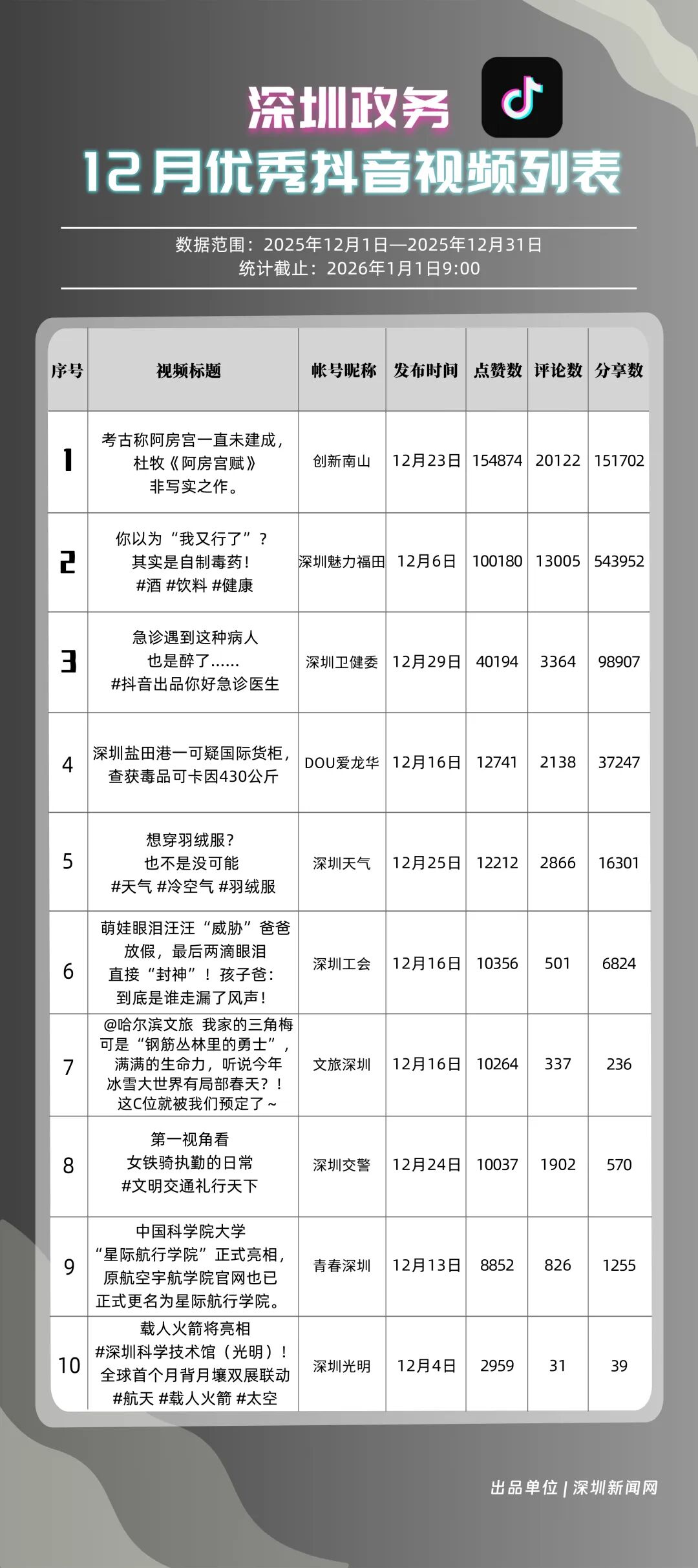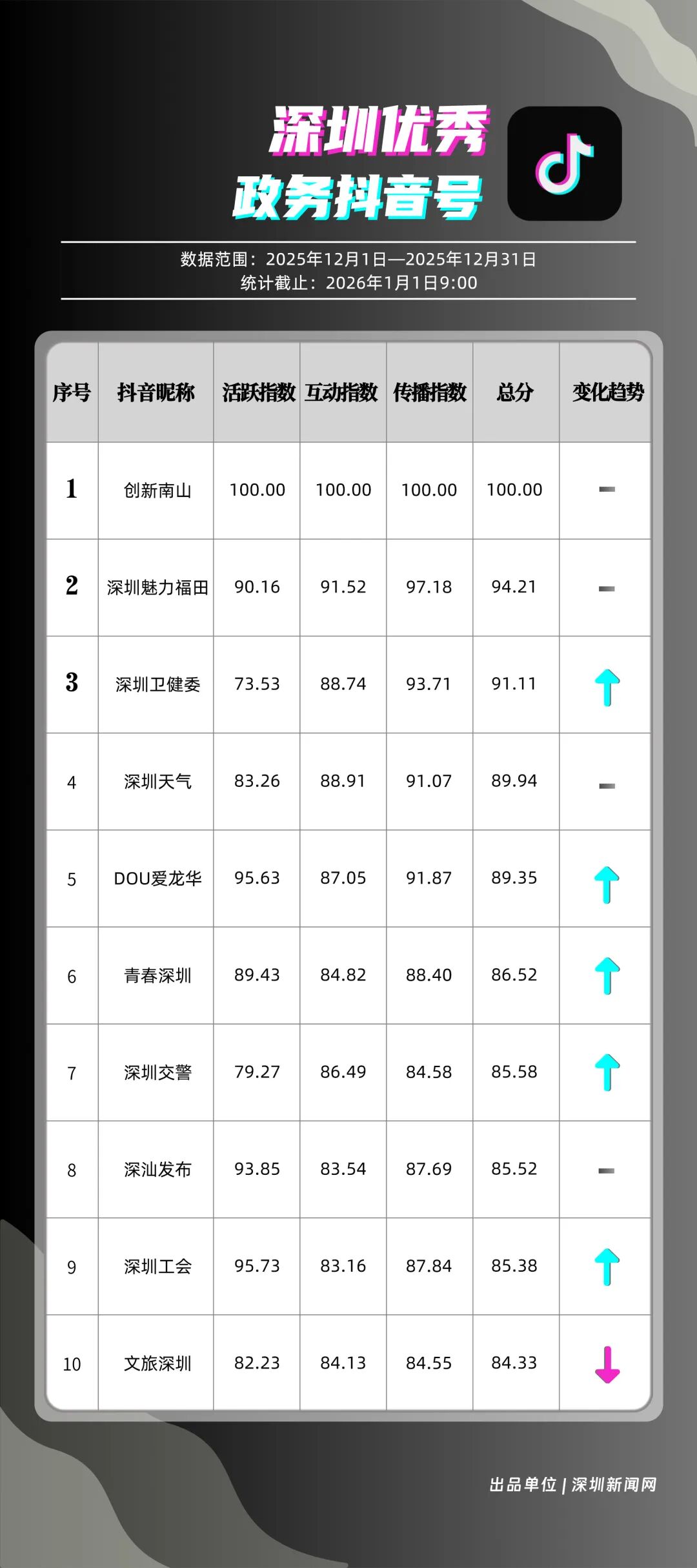 南山區(qū)單月抖音視頻點(diǎn)贊超120萬(wàn)!2025年12月“深圳優(yōu)秀政務(wù)新媒體矩陣”榜單發(fā)布
