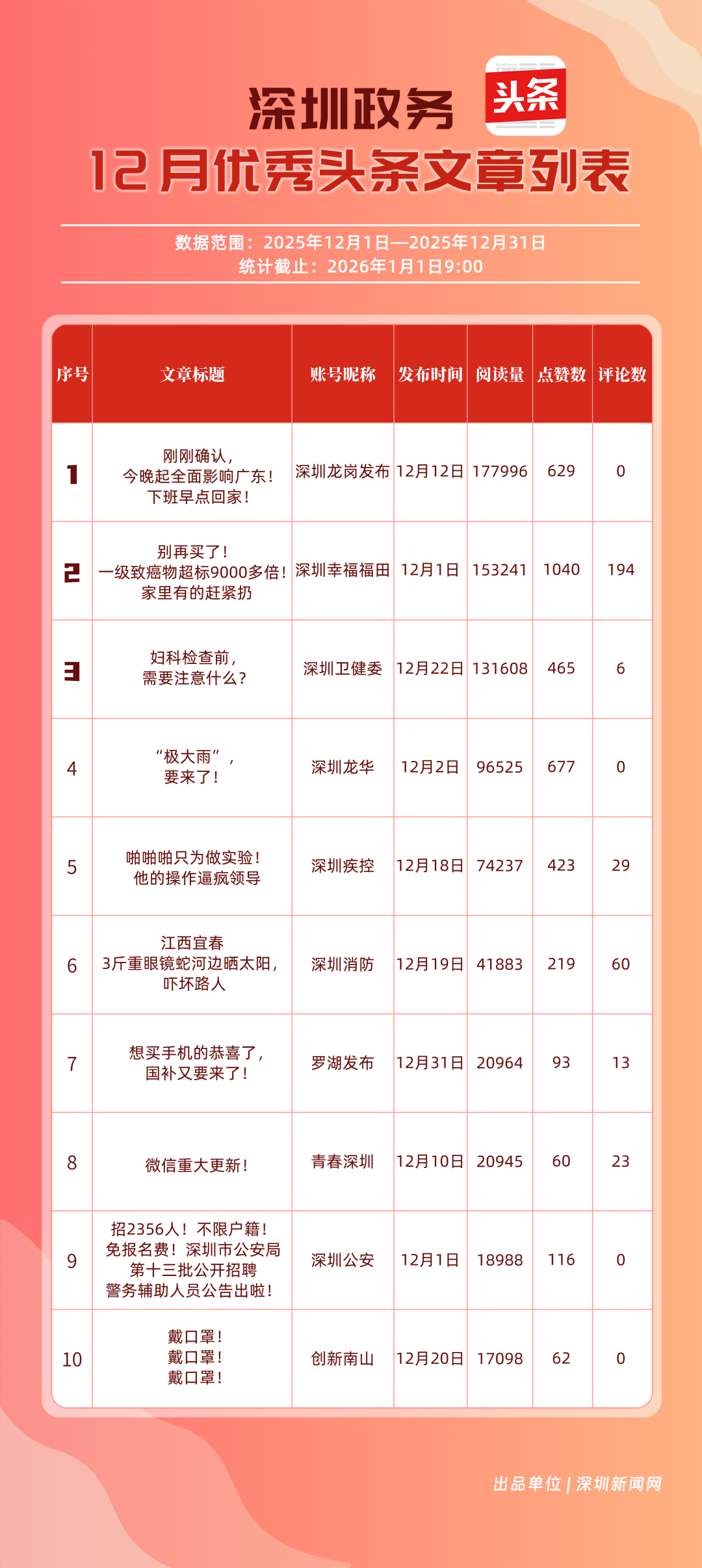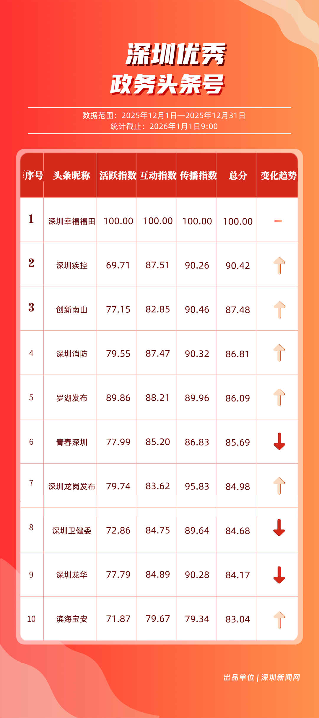2025年12月期《深圳優(yōu)秀政務(wù)新媒體矩陣》正式發(fā)布,本期上榜矩陣以“接地氣、有溫度、強(qiáng)互動(dòng)”的創(chuàng)作理念,立足民生關(guān)切、深挖區(qū)域特色,以多元?jiǎng)?chuàng)新實(shí)踐在政務(wù)傳播賽道強(qiáng)勢(shì)突圍,展現(xiàn)深圳城市發(fā)展、文化傳承的生動(dòng)圖景,為政務(wù)新媒體高質(zhì)量發(fā)展注入澎湃動(dòng)能。